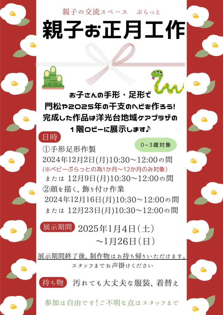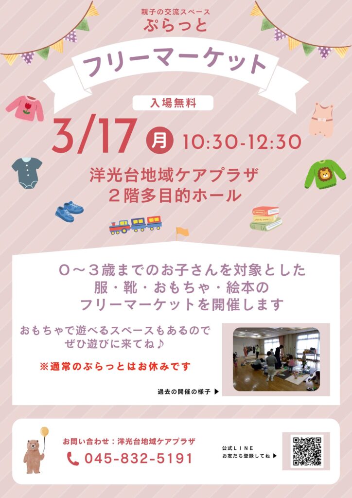 親子の交流スペース「ぷらっと」チラシ 毎週月曜日10:30〜12:00に洋光台地域ケアプラザで開催される「ぷらっと」は、0〜3歳児と保護者向けの自由交流スペースです。ベビー会や布おもちゃ、読み聞かせなど週替わりの企画があり、予約不要・無料で気軽に参加できます。